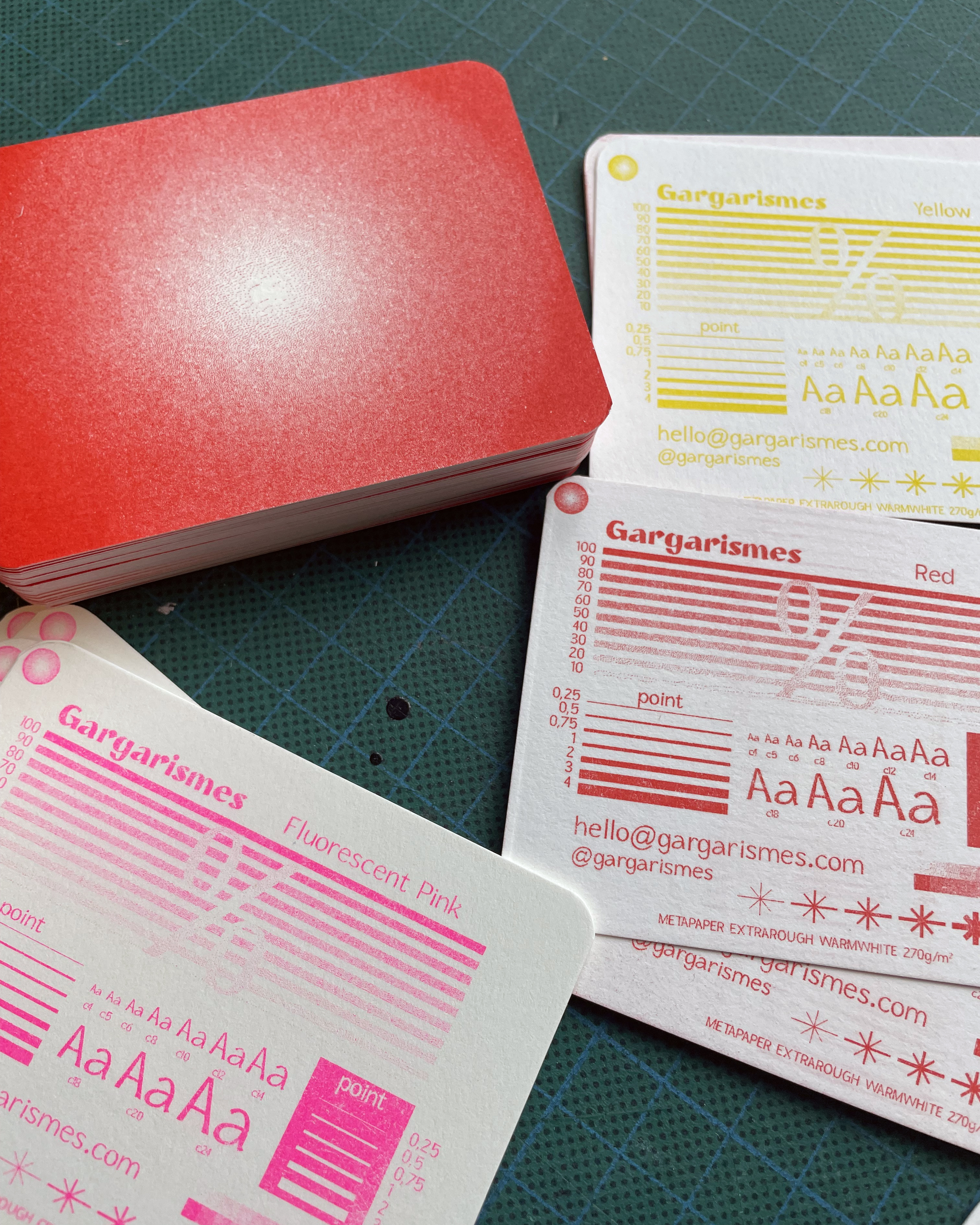 Les encres Riso ne sont pas conformes aux standards de couleurs. Les références hexadécimales permettent de simuler un aperçu sur logiciel. Ces encres sont transparentes, la teinte du papier et les superpositions apportent des variations.
