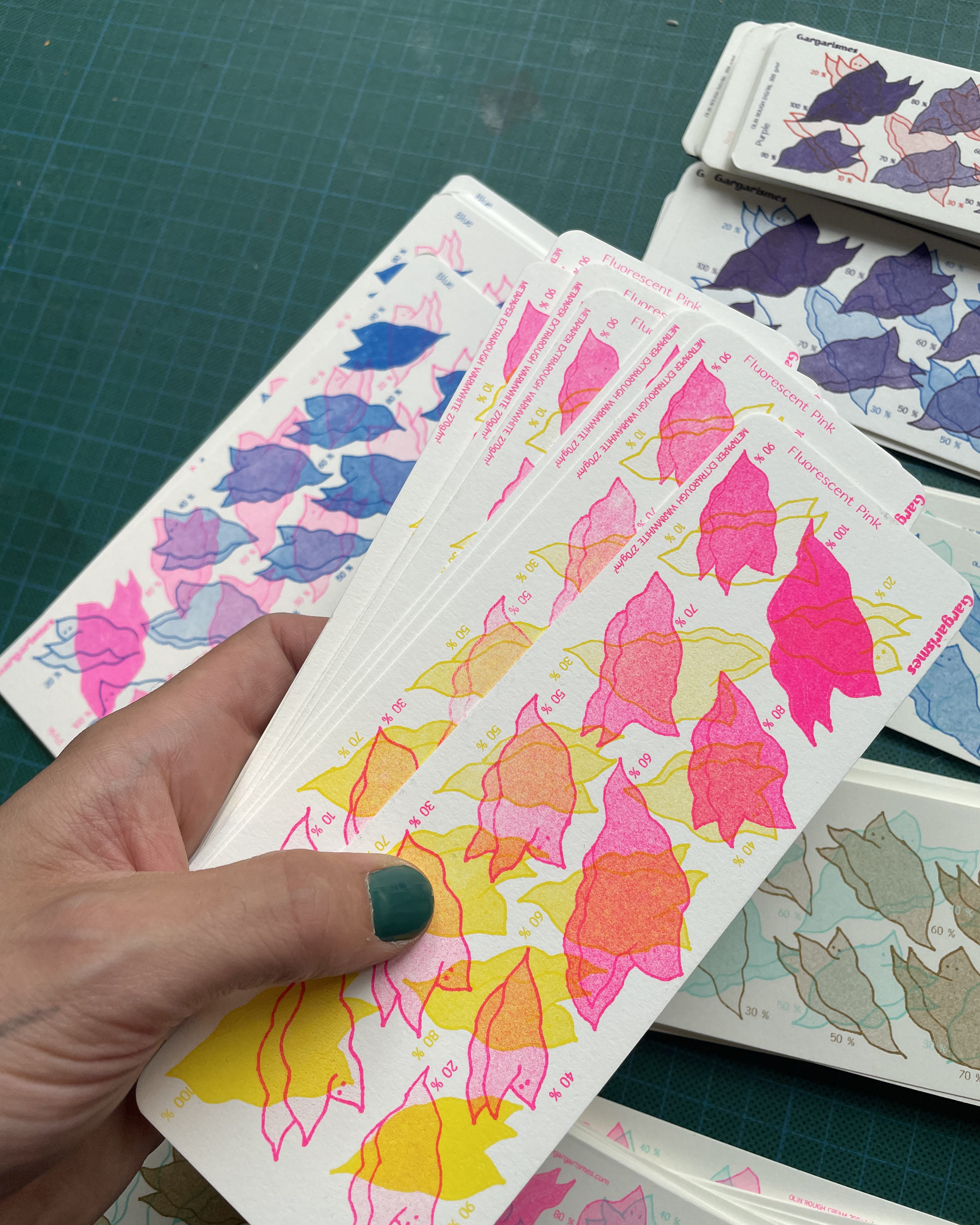 Les encres Riso ne sont pas conformes aux standards de couleurs. Les références hexadécimales permettent de simuler un aperçu sur logiciel. Ces encres sont transparentes, la teinte du papier et les superpositions apportent des variations.
