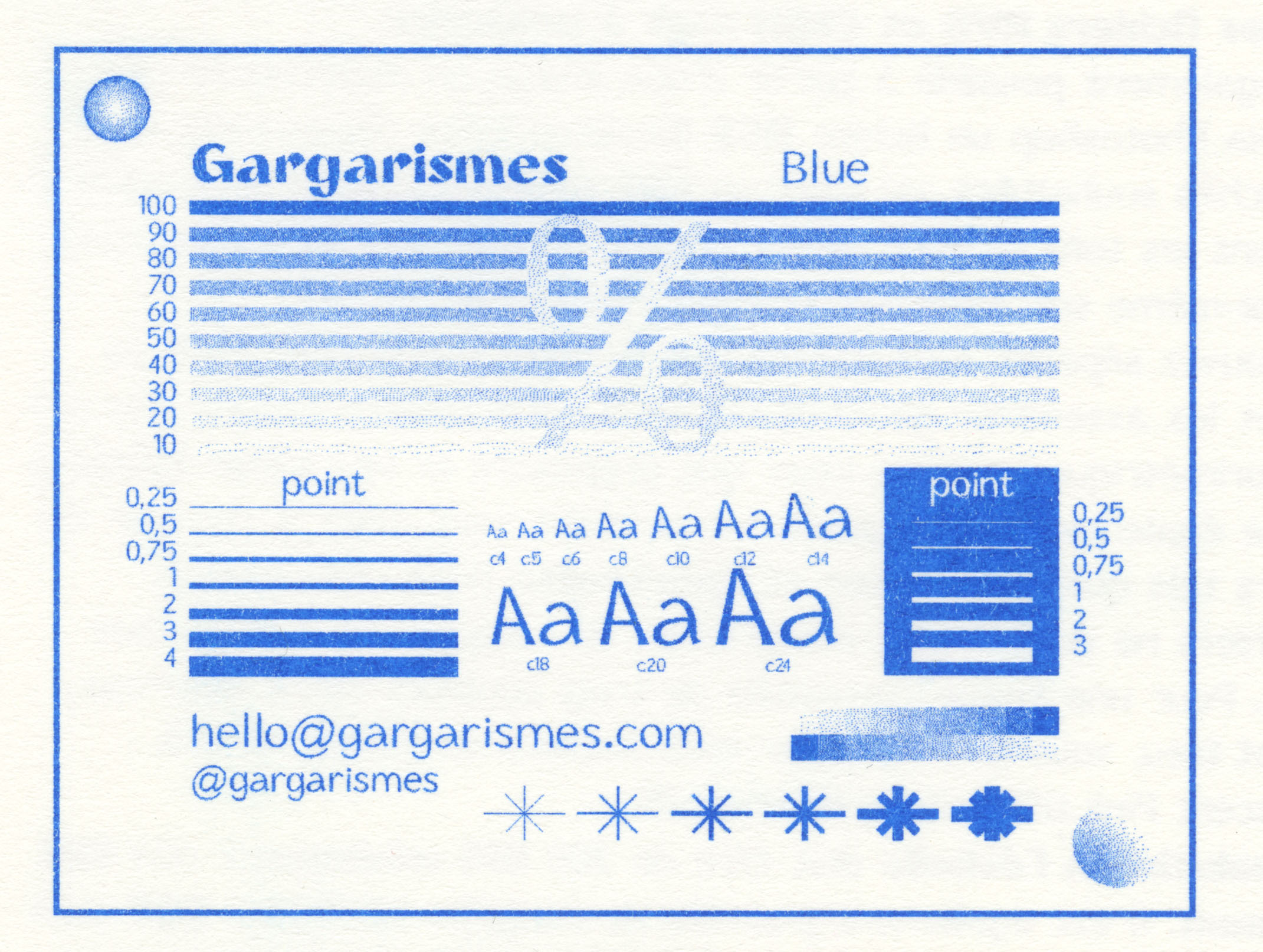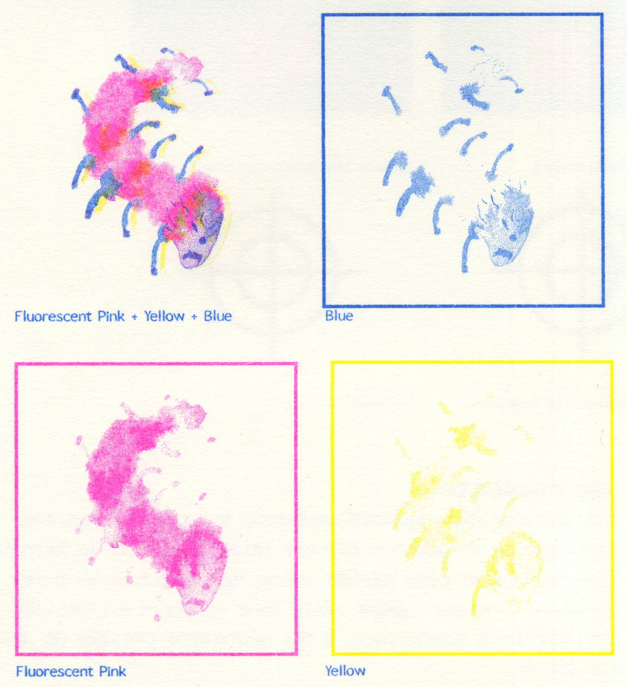 Par exemple, un bleu sur un rose donnera un violet plus ou moins intense selon la densité de la trame ou de l'aplat entre les deux couches. Pour se faire une idée du rendu, il est possible de mettre les calques en mode produit sur Photoshop ou alors directement régler l'opacité sur zéro via l'onglet uniformité que l'on met à 0% sur la couche de ton direct lorsque l'on travaille en multicouche.